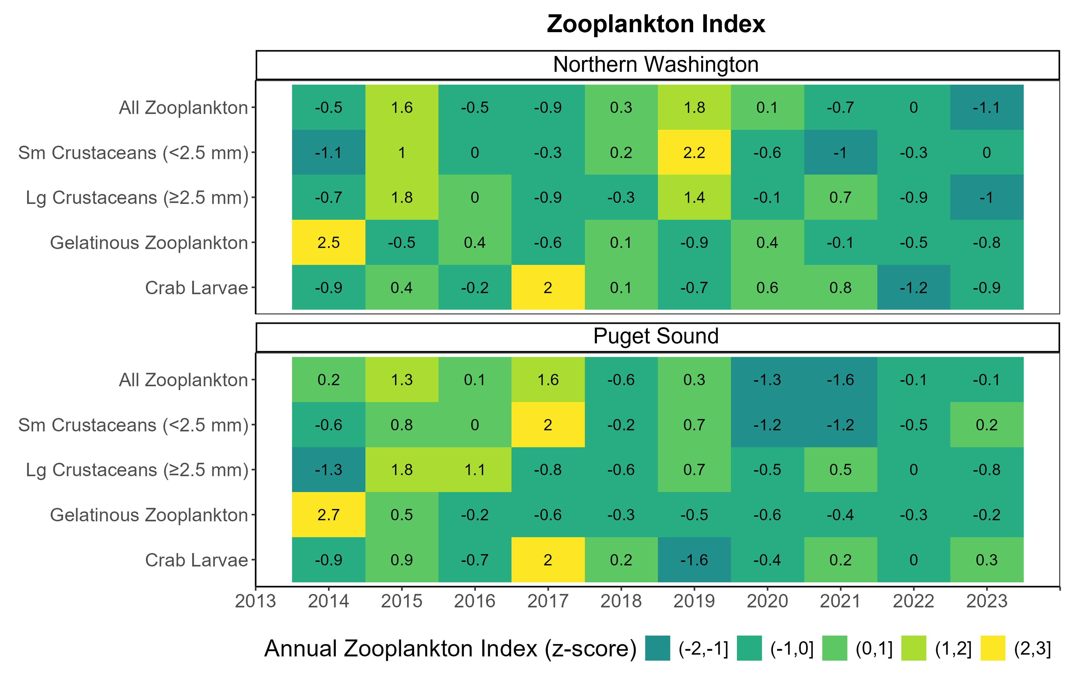 The Zooplankton Index is a concise way of visualizing the variability of biomass for select taxonomic groups in Northern Washington and Puget Sound regions. While these values do not indicate “good” or “bad” outcomes for zooplankton, they are useful in determining the degree of change these communities encounter over spatio-temporal scales.