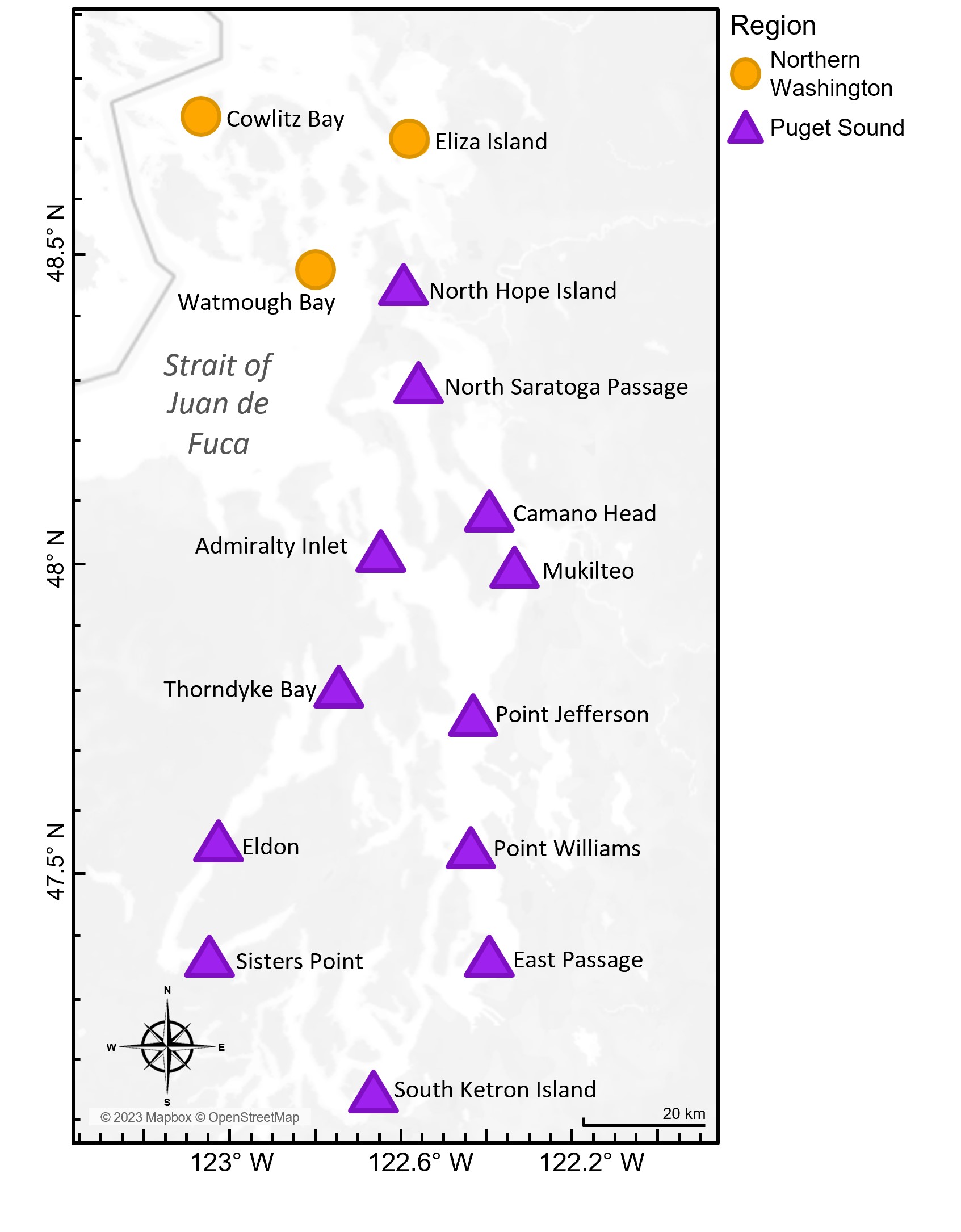 The Puget Sound Zooplankton Monitoring Program (started as the Salish Sea Marine Survival Project in 2014) provides an extensive, ongoing dataset documenting metrics of zooplankton from 15 stations in the southern Salish Sea throughout Northern Washington (NWA) and Puget Sound (PS) (Figure 1). The data included in these Indicators are compiled from 200-µm mesh vertical net tows, which are collected bi-weekly all year round, with lower frequency in the winter. The nets are towed through the full water column, from within 5 m from the bottom, or to a maximum of 200 m, to the surface. Samples are preserved in 5% formalin and are processed by expert taxonomists at the University of Washington, with certain taxa identified to species level. Data are then statistically analyzed to develop indicators of environmental variability.