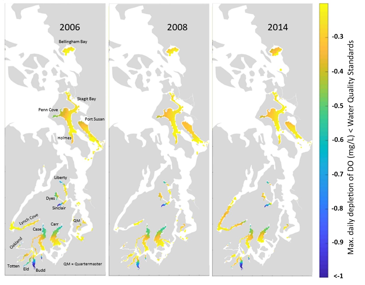 The spatial distribution of the cumulative number of days that the dissolved oxygen concentrations were below the water quality standards for 2006, 2008, and 2014 are shown below. Various locations during 2006, such as Lynch Cove, Holmes Harbor, and parts of Skagit Bay, are predicted to have experienced a significantly higher number of days below the standard compared to 2008 or 2014. Other locations such as Penn Cove, portions of Port Susan, Quartermaster Harbor, Case, Carr, Sinclair and Dyes Inlets, and Liberty Bay are predicted to have experienced a cumulative three months or more of noncompliance with the water quality standard during each of the three years. The maximum number of cumulative noncompliant days occurred in Carr Inlet in 2006 and 2008, where for 250 and 216 days, respectively, water quality standards were not met. In 2014, however, the maximum number of cumulative noncompliant days (198) occurred in Quartermaster Harbor.