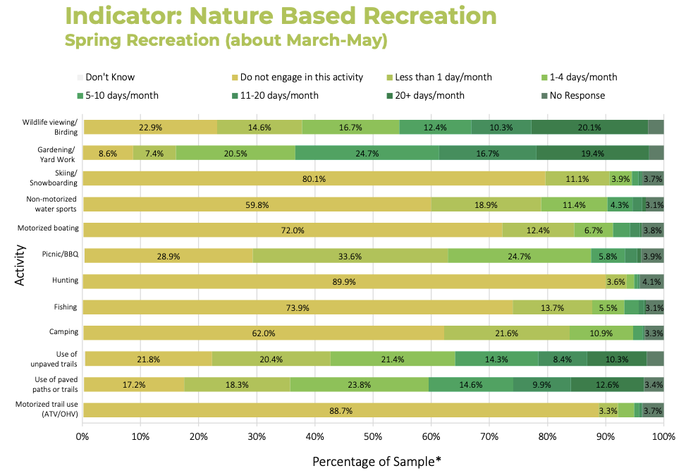 The outdoor recreation indicator is based on two questions in the survey that ask respondents to rate their engagement in 12 categories of outdoor activities on a six-point scale from never to 20+days/month during the season. Each iteration of the survey asks about the same question in two different seasons. In 2024, respondents were asked about the activities in fall and spring.