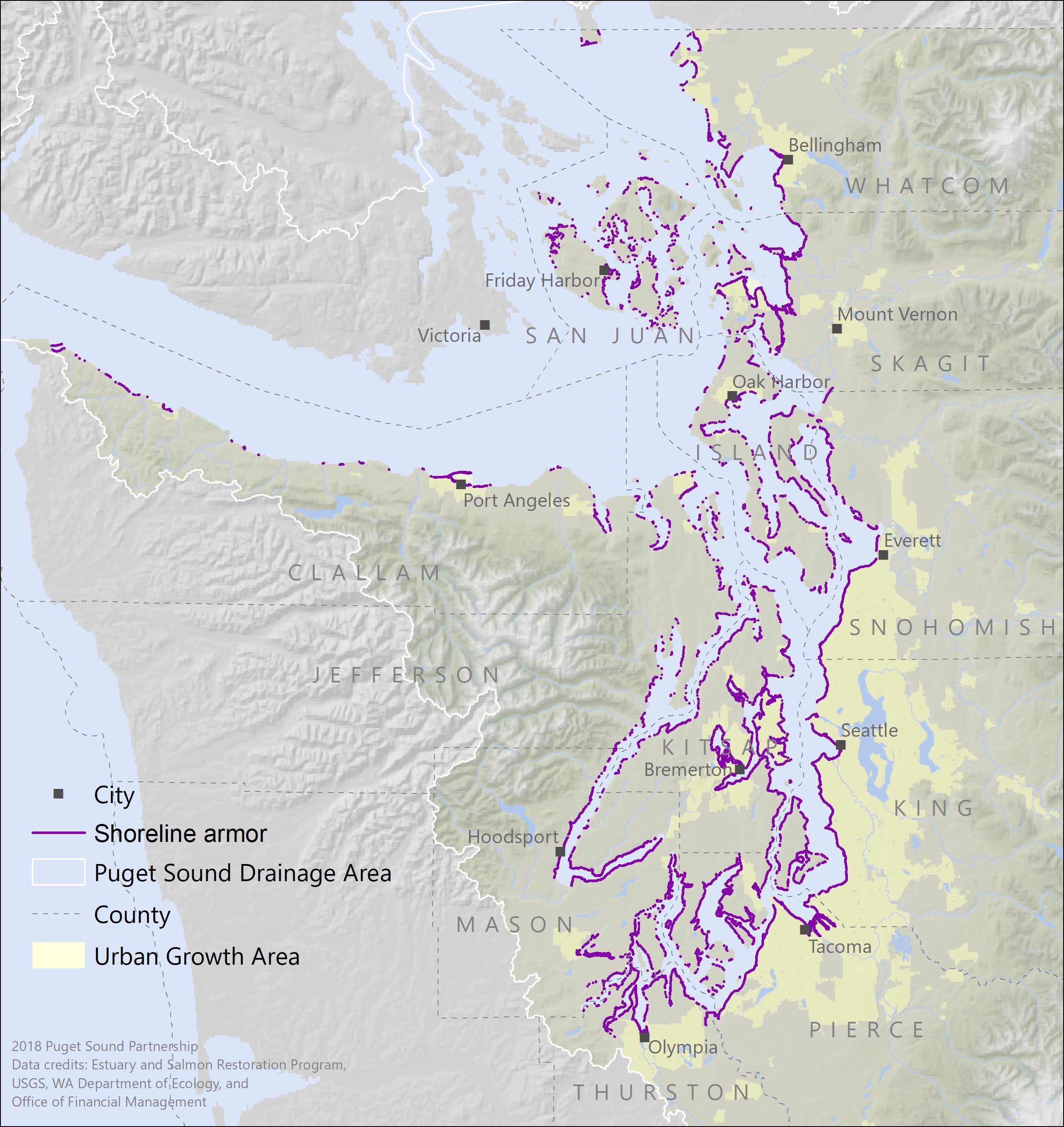Shoreline armor is the most common type of shoreline modification on Puget Sound. The term includes structures like bulkheads, seawalls, and rip rap. In addition to directly covering beach habitat, shoreline armor alters geologic processes that supply sediment to build and maintain beaches and spits. Armor also impacts erosion patterns on nearby beaches, alters beach substrate and hydrology, and reduces the availability of large wood.