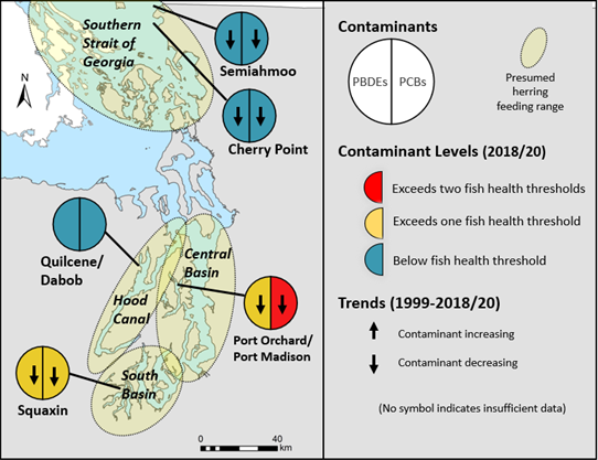 Pacific herring are a keystone species in the pelagic (open-water) food web, serving as important prey for virtually all large predatory fish and fish-eating seabirds, and most marine mammals in Puget Sound. Herring have a high fat content and accumulate persistent organic pollutants (POPs) that may be present in the pelagic food web because of the propensity of these contaminants to accumulate in lipid-rich tissues. As such, they are likely to accumulate contaminants from their environment and reflect regional spatial patterns of contamination.
