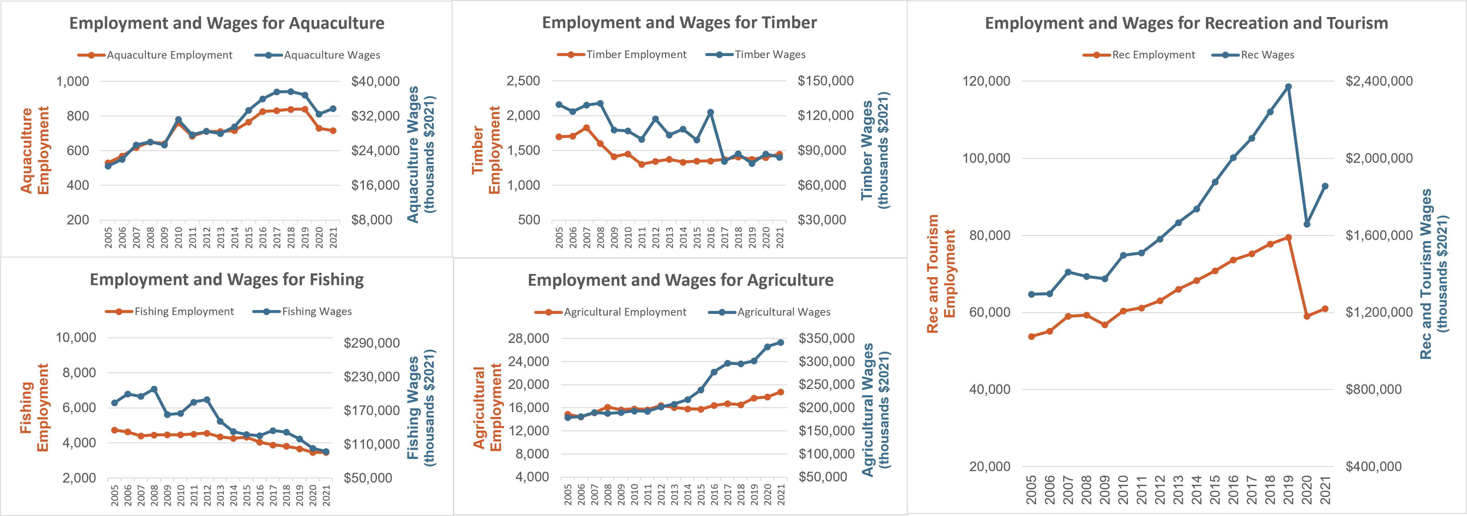 In recent years, employment and wages in shellfish aquaculture shows a notable upturn for 2014-2019, with a decline in 2020 and some signs of recovery in 2021. While timber employment remained steady between 2012 and 2021, recent timber wages have fluctuated. Fishing employment and wages have declined since 2012. Agricultural employment increased from 2015 to 2017 after a decline since 2012, but took a slight dip in 2018 and increased again in 2019 and onwards. Agriculture wages have continued to increase for the past several years with a small decrease in 2018. Tourism and recreation show significant increases in employment and wages since 2009, but saw a noticeable decrease in 2020 and then some recovery in 2021.
