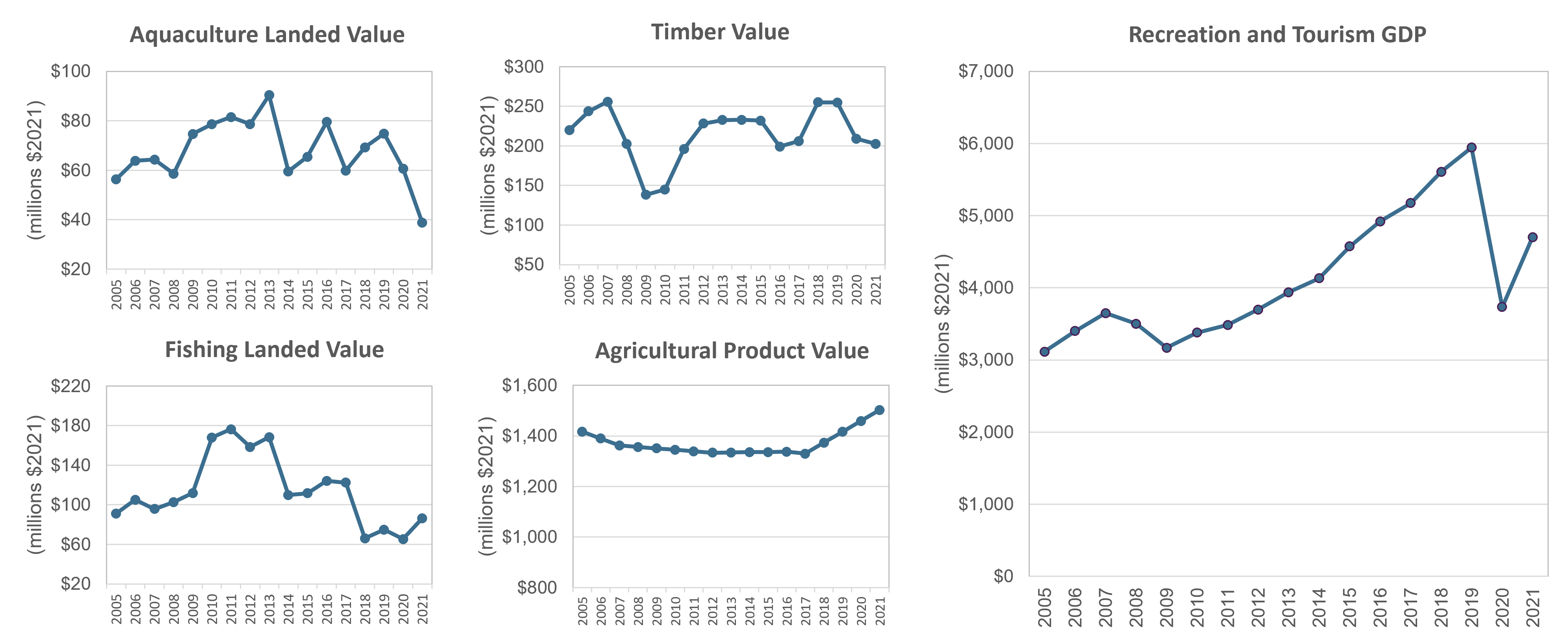 Coastal recreation and tourism is made up of many sectors including boat dealers, restaurants, hotels and lodging, marinas, RV parks and campsites, water tours, sporting goods, recreational services, zoos, and aquaria. Many of these subsectors provide services whose production value cannot be measured as precisely at the local level as a single commodity like timber or fish.